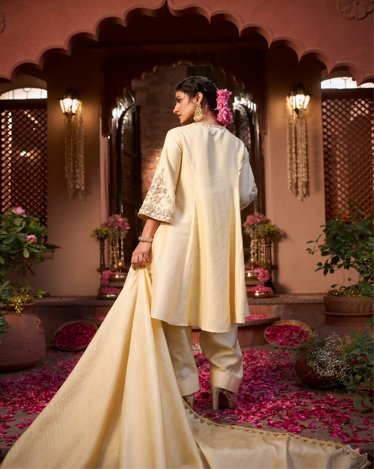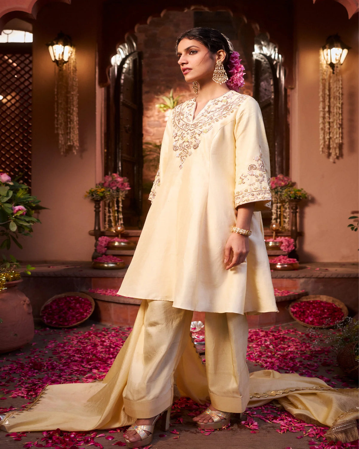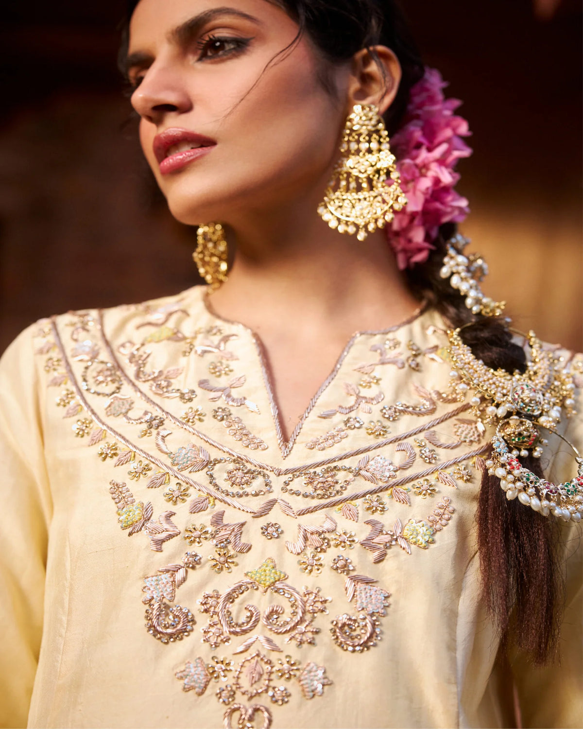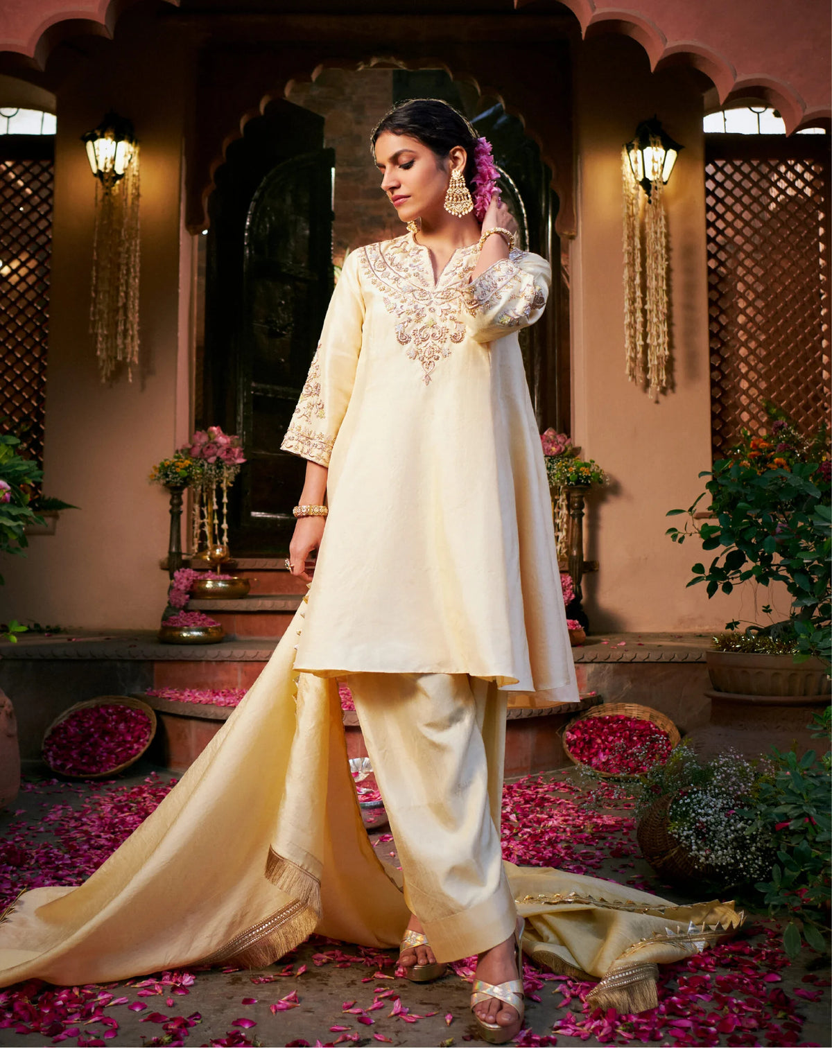 Dapka, sequin, silk thread and nakshi embroidered kurta, quarter slightly flared sleeves with plain Punjabi salwar. Gota border dupatta. All made of khurkhul handwoven silk and cotton shantoon lining.