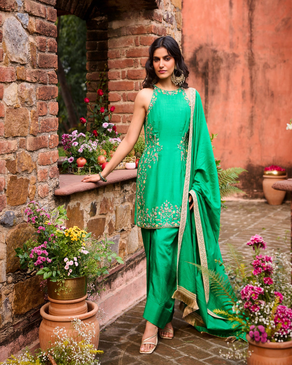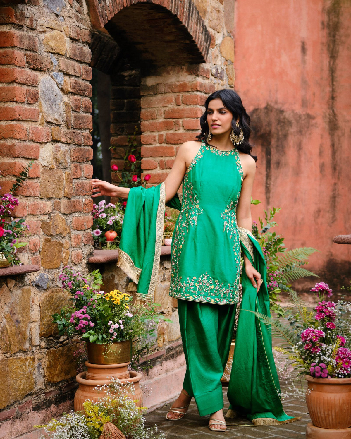 Halter neckline kurta with different types of sequin, dapka, pink dapka, silk thread and nakshi embroidery, paired with plain Punjabi salwar. Gota border dupatta. All made of khurkhul handwoven silk and cotton shantoon lining.