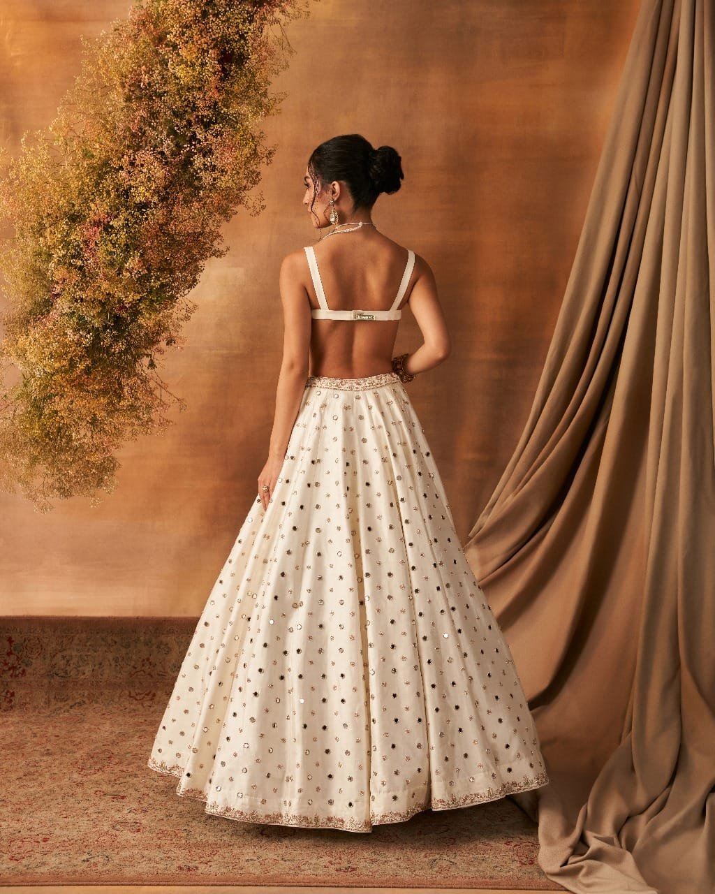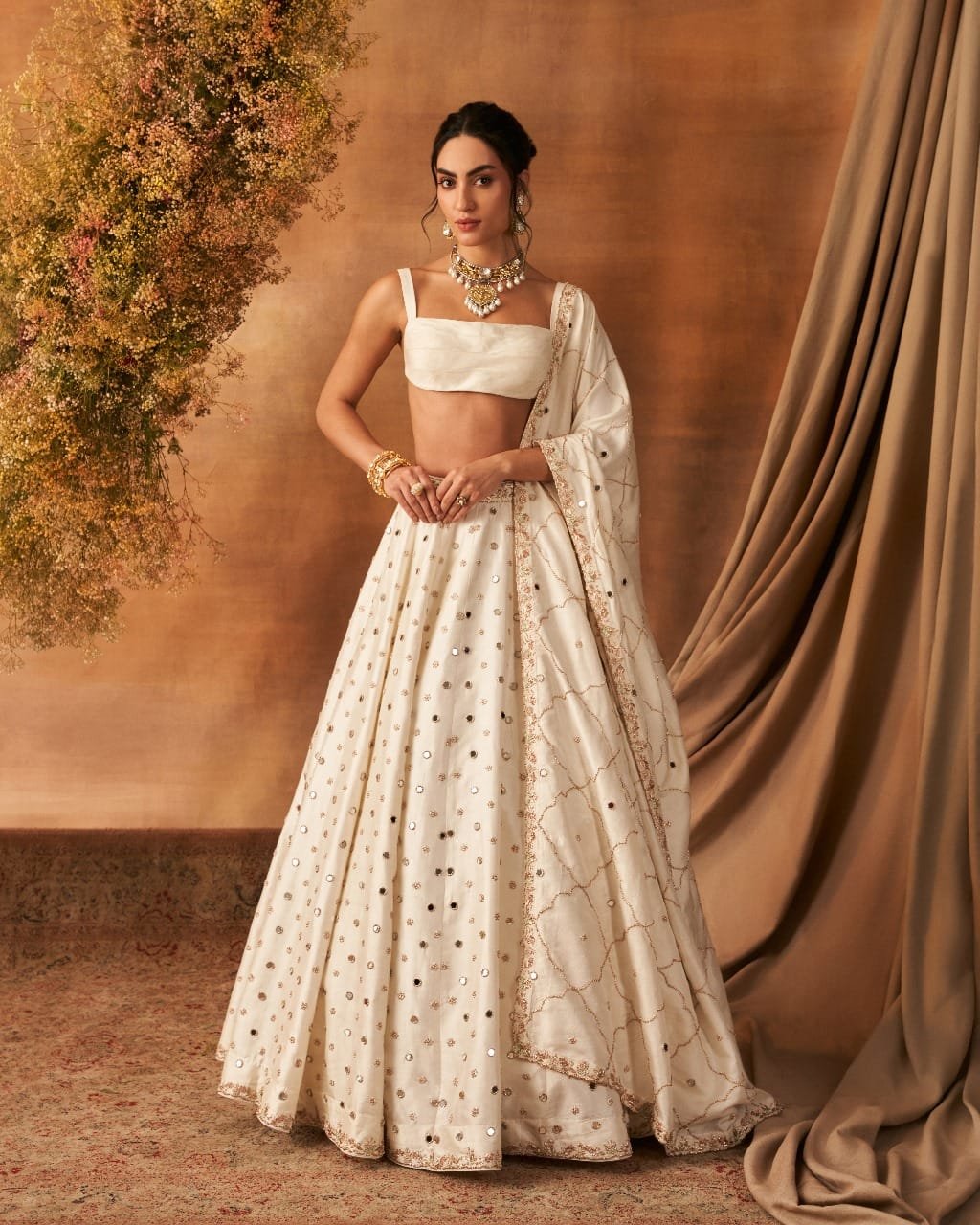 Blouse, lehenga and dupatta made of handowen silk (Khurkhul silk) with Dapka, Nakshi , round sheshe, white small pearls , resham , sequin embroidery. Cotton shantton lining and lehenga has Cancan layers. Pockets on right side of the lehenga. Draped blouse.