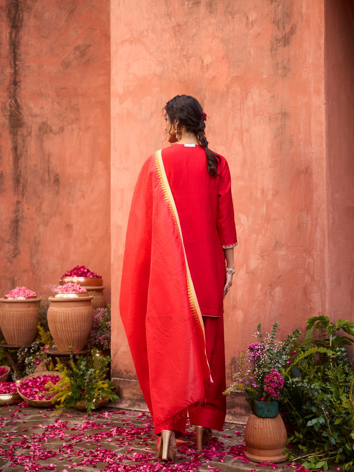 Surai, pearls, sequins, dapka, dori, nakshi and kora embroidered long kurta with quarter sleeve length, paired with gota embroidered churidar and mulberry handwoven dupatta. Kurta and churidar made of khurkhul handwoven silk with cotton shantoon lining.