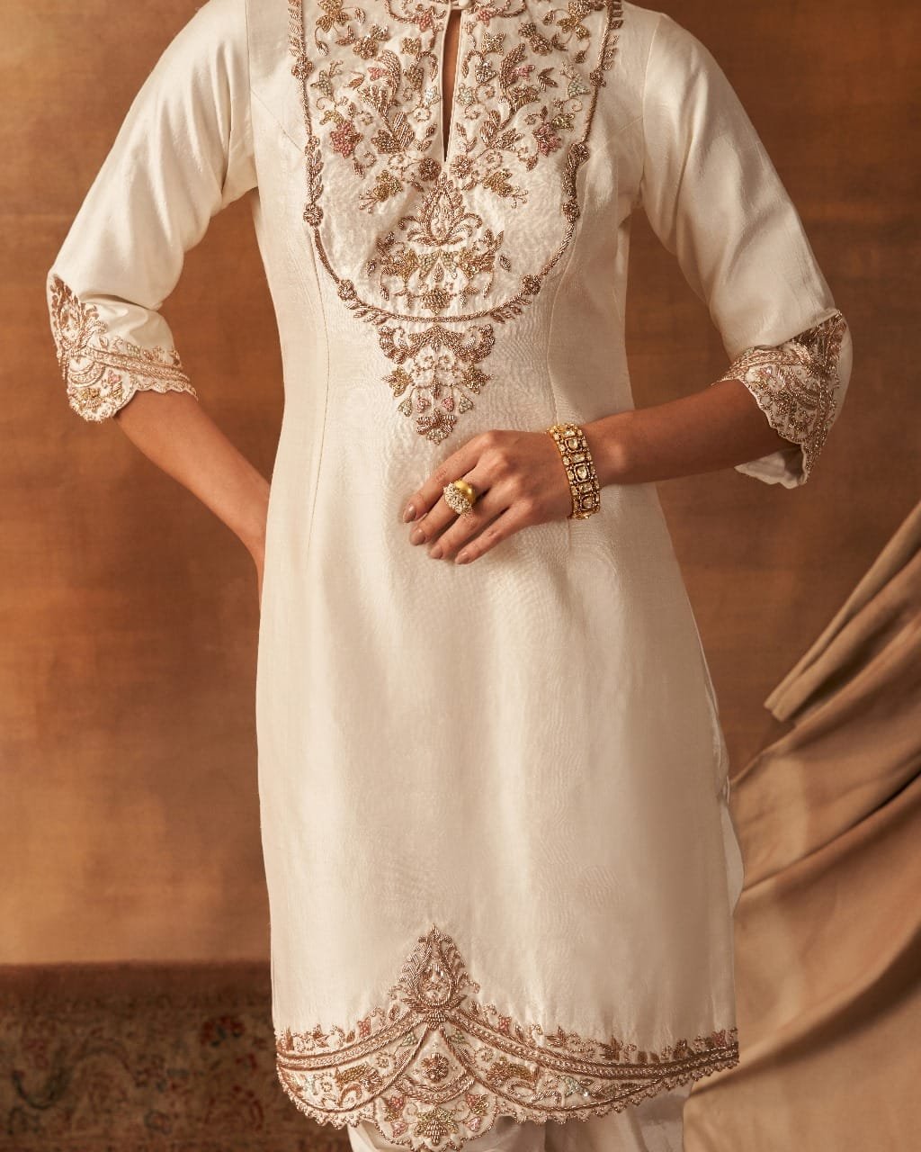 Kurta, dhoti pants and dupatta made of handwoven silk (Khurkhul silk) with Dapka, nakshi, small pearls, resham, kasab, sequin embroidery. Cotton shantoon lining. Dhoti pants has pockets on both the sides.
