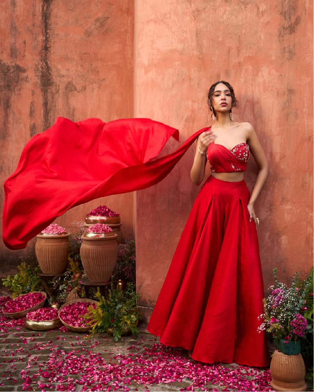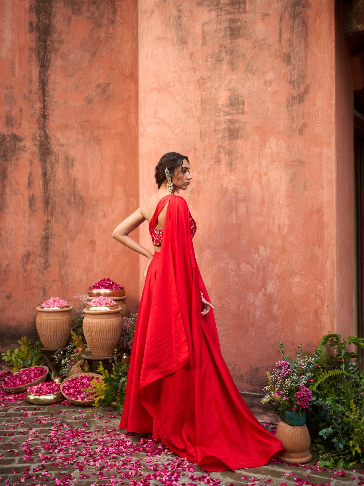 One-shoulder draped embroidered blouse with flare pants. Both made of khurkhul handwoven silk with cotton shantoon lining.
