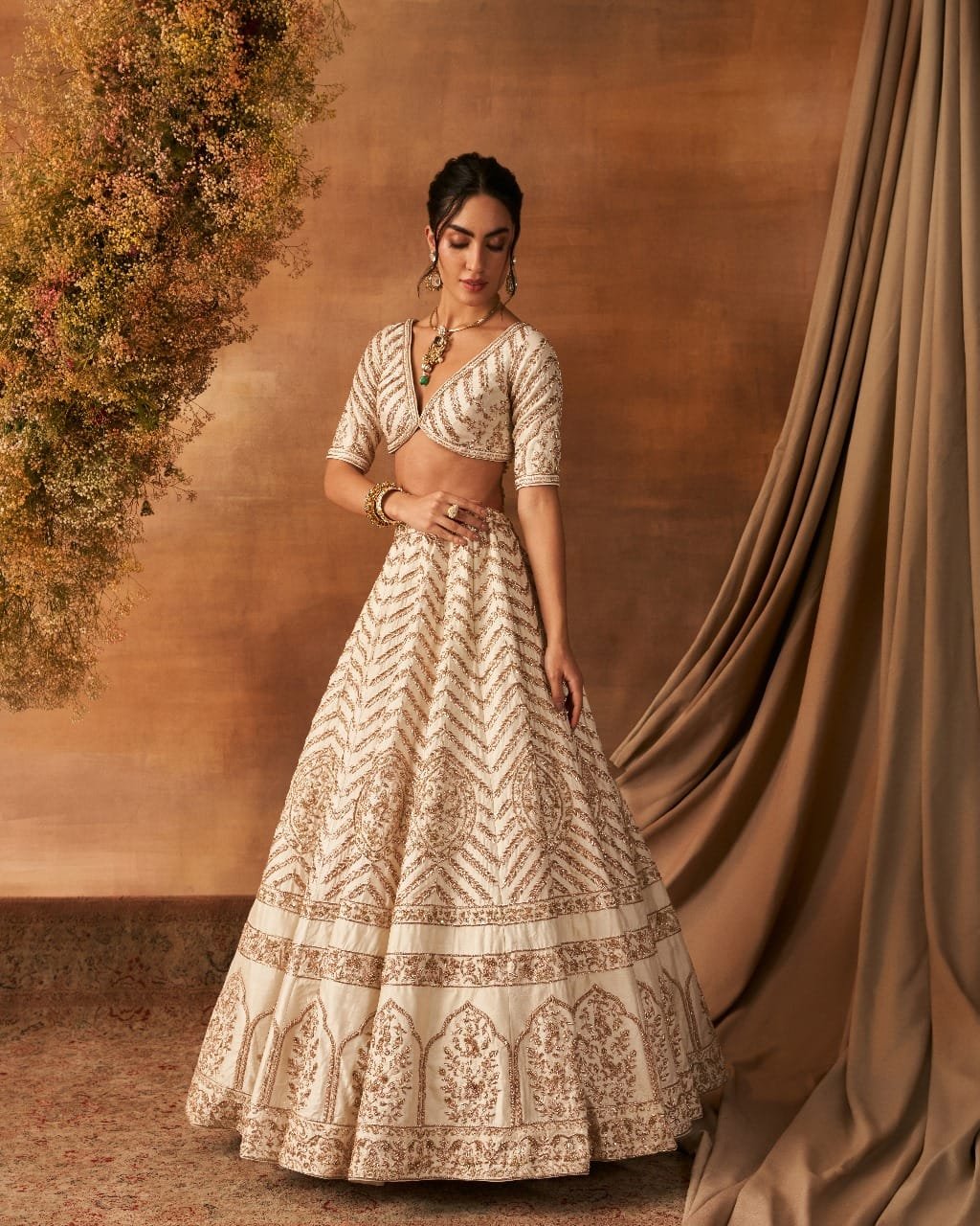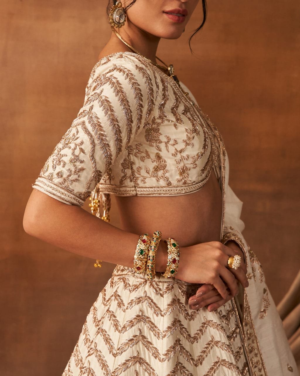 Blouse, lehenga and dupatta made of handowen silk (Khurkhul silk) with Dapka , Nakshi, sequin, small off white pearls, kora , dori , kardana embroidery. Cotton shantoon lining and lehenga has cancan layers. Pocket on the right side of the lehenga.