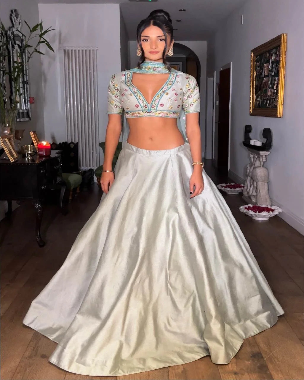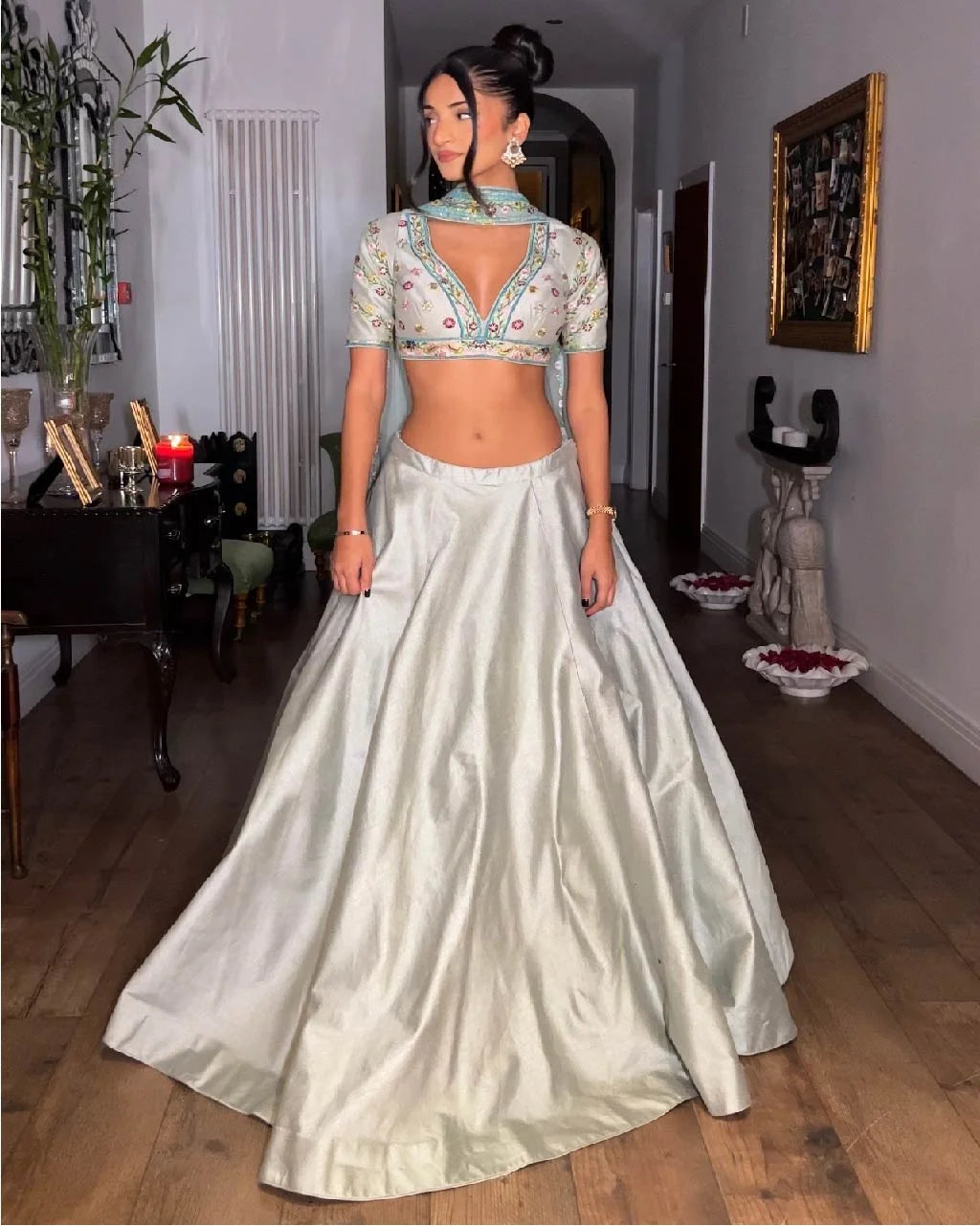 Silk thread embroidered blouse with 10" sleeves and lehenga made of khurkhul silk, paired with mulberry dupatta.