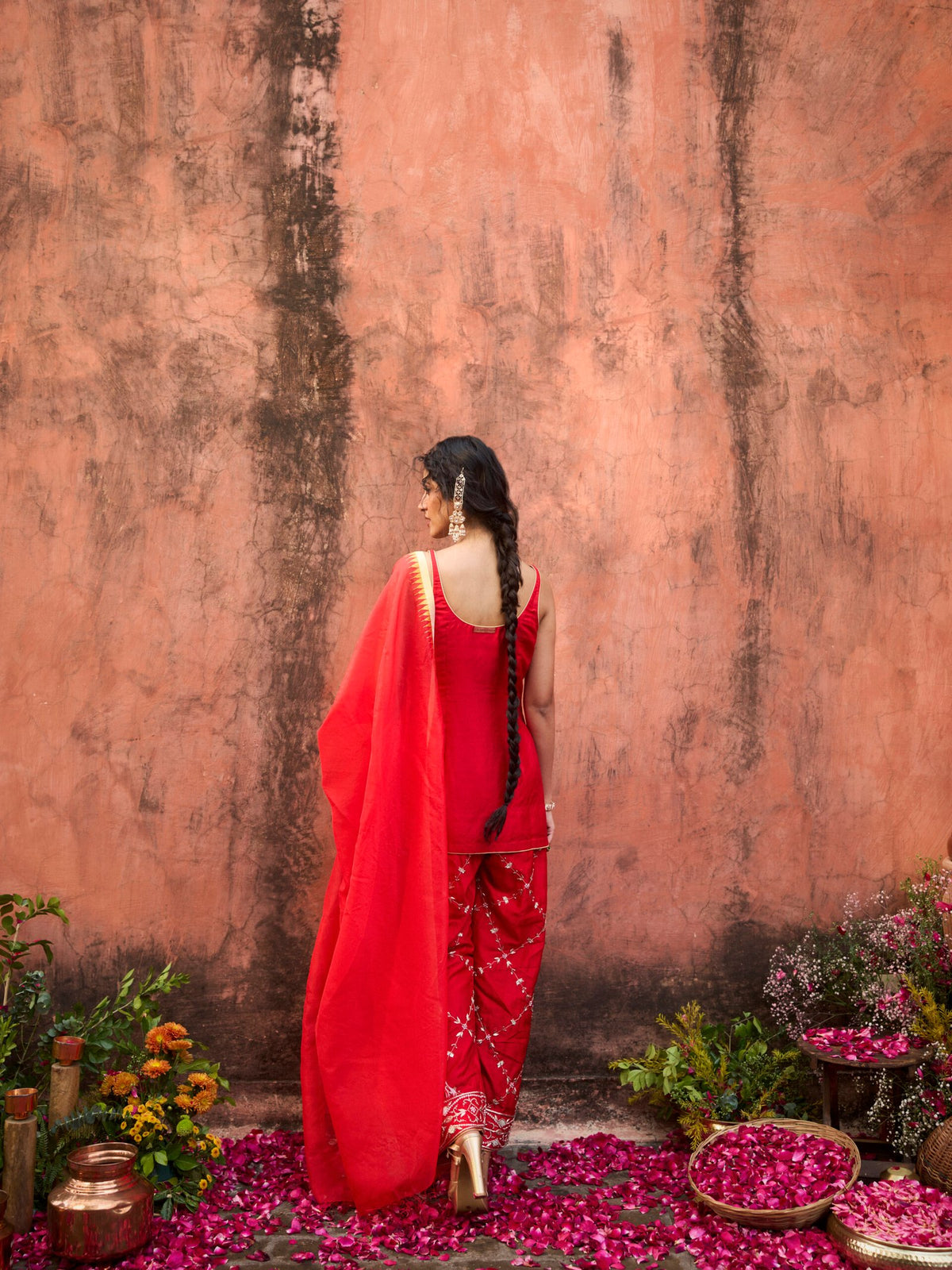 Round neckline short kurta with gold dori piping and dori, pearls, dapka and resham embroidered salwar with mulberry handwoven dupatta. Kurta and salwar made of khurkhul handwoven silk with cotton shantoon lining.
