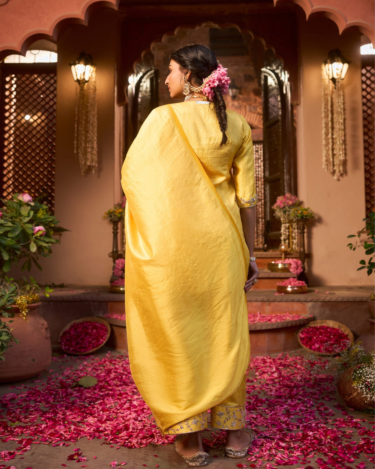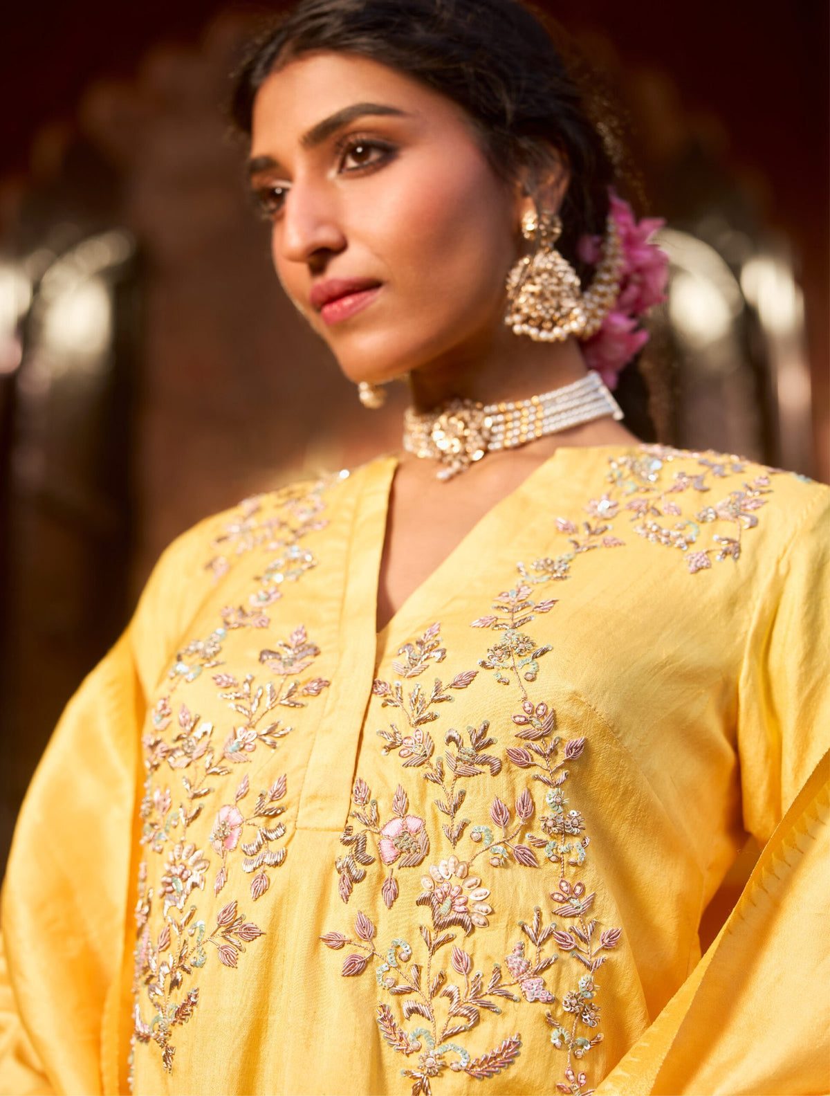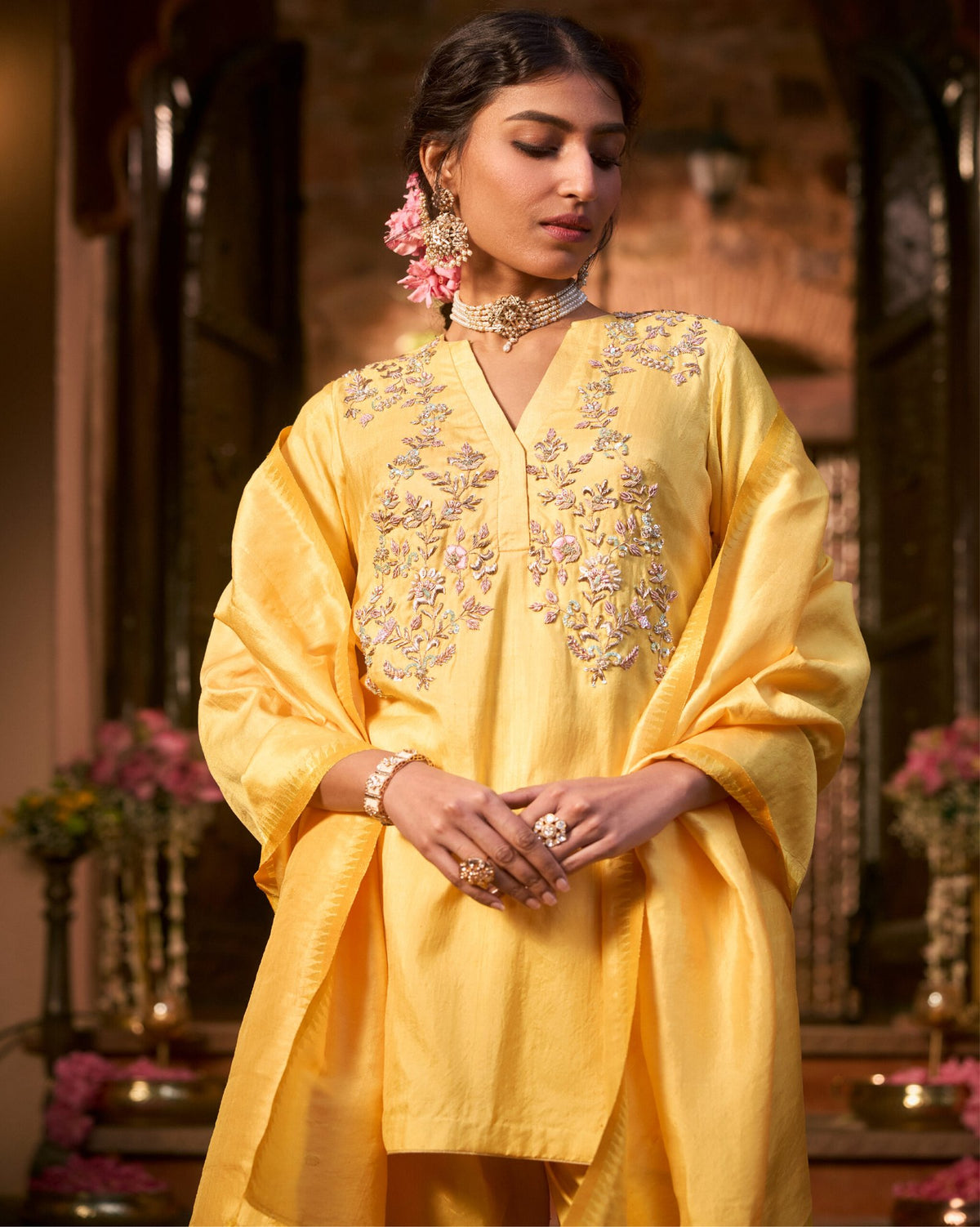 V neckline with a button-down front and dori, dapka, nakshi, kashti, kardana, kora embroidered kurta, quarter sleeve length and plain Punjabi salwar. Gota border dupatta. All made of khurkhul handwoven silk and cotton shantoon lining.