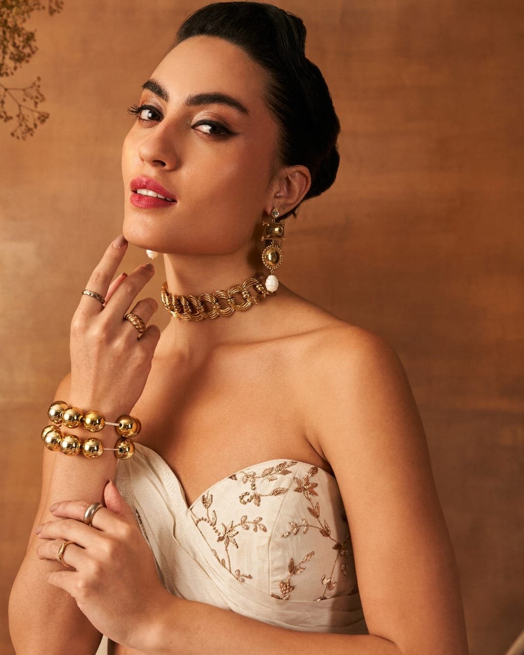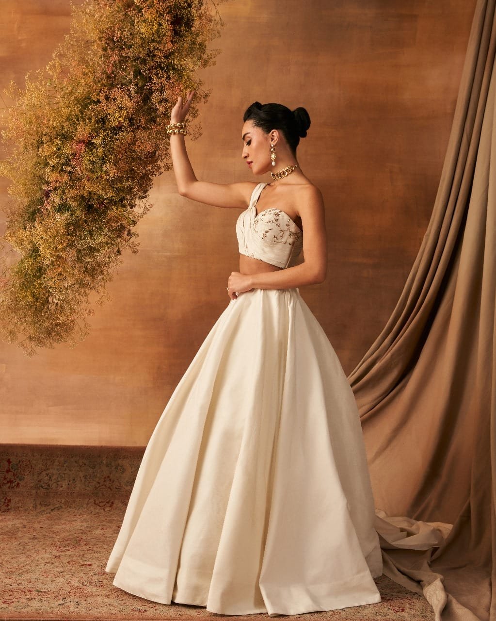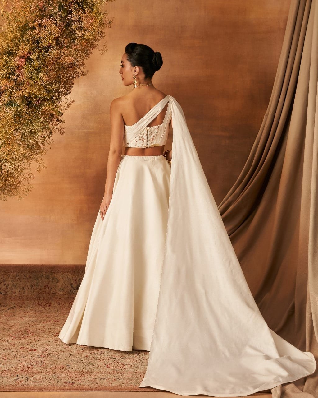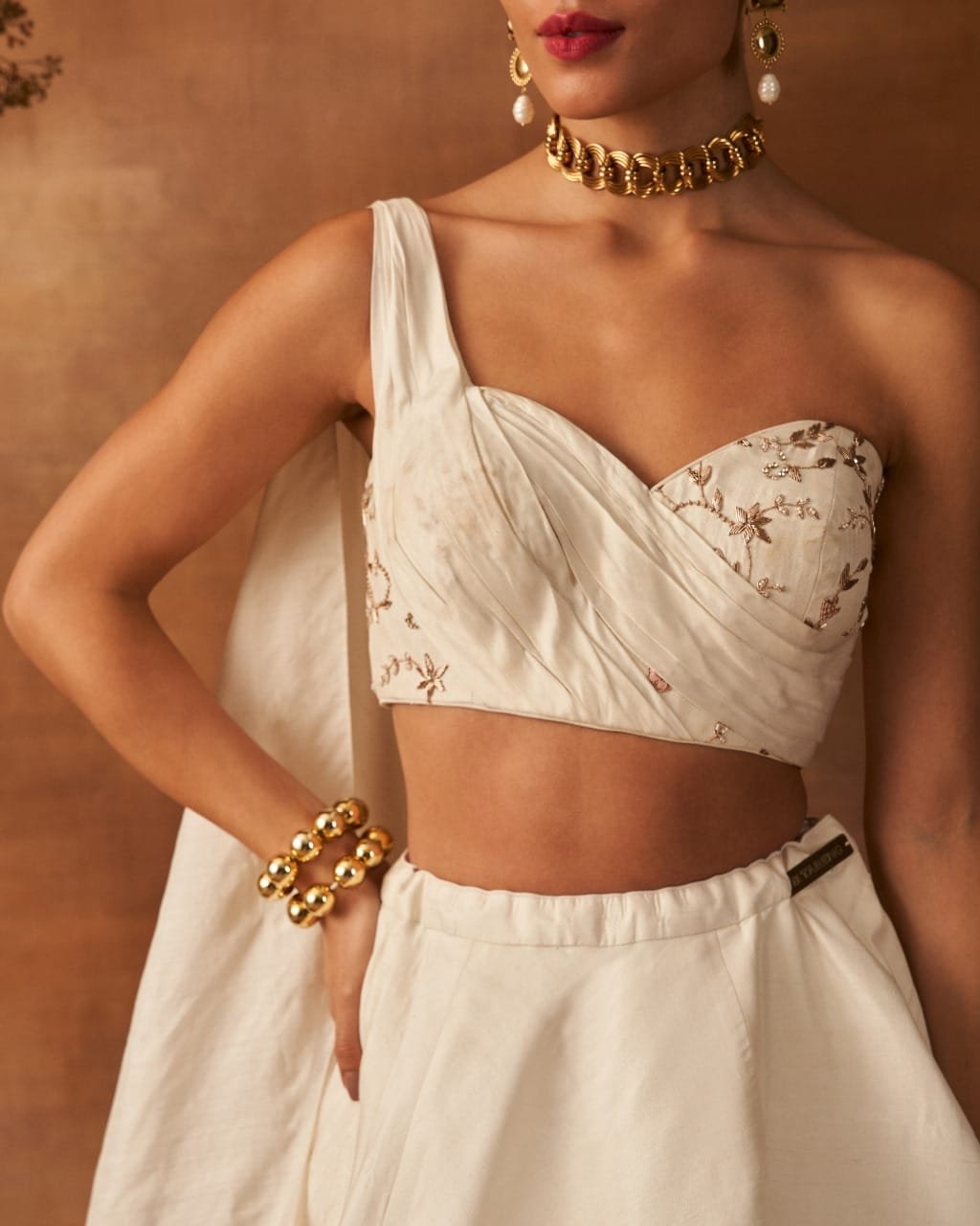 One-shoulder draped corset blouse with dapka, nakshi, sequin, small pearls, dori, resham embroidery, and a plain skirt made of handwoven silk (Khurkhul silk). The skirt has cotton shantoon lining and cancan layers, and features a pocket on the right side of the skirt.