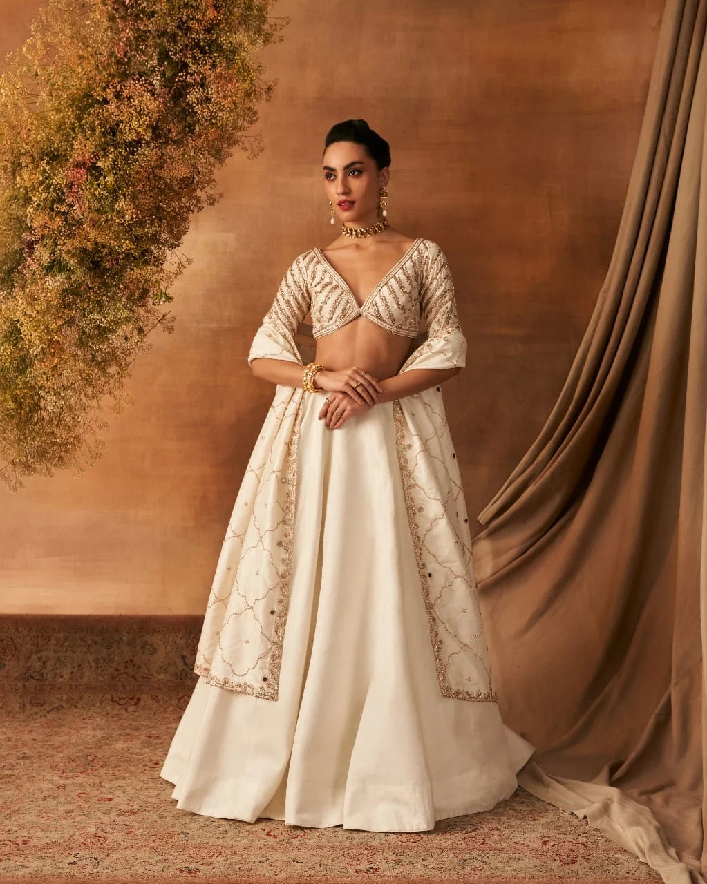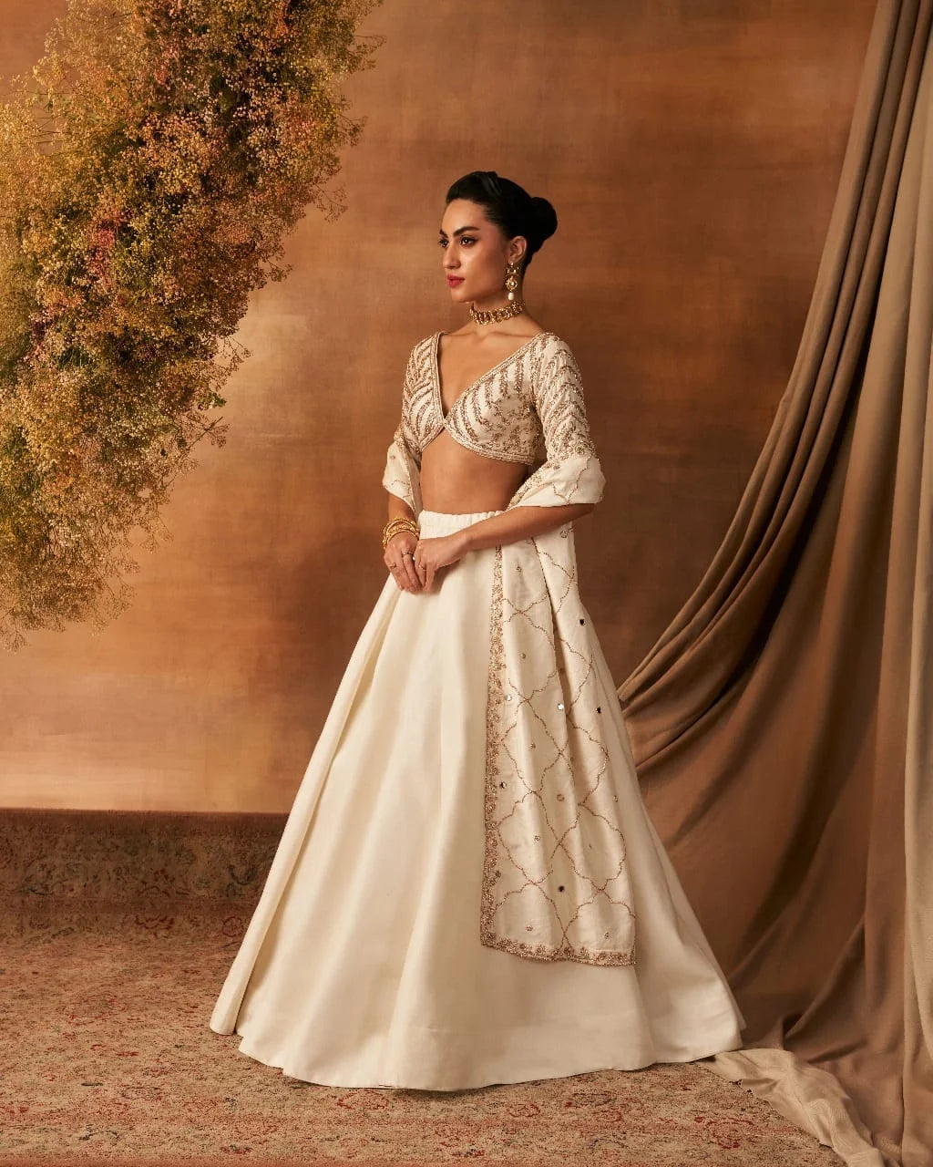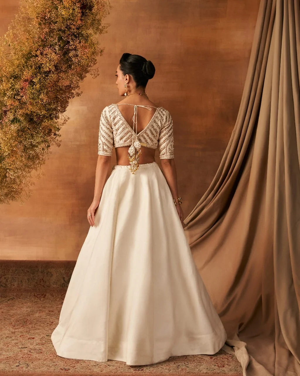 One-shoulder draped corset blouse with dapka, nakshi, sequin, small pearls, dori, resham embroidery, and a plain skirt made of handwoven silk (Khurkhul silk). The skirt has cotton shantoon lining and cancan layers, and features a pocket on the right side of the skirt.