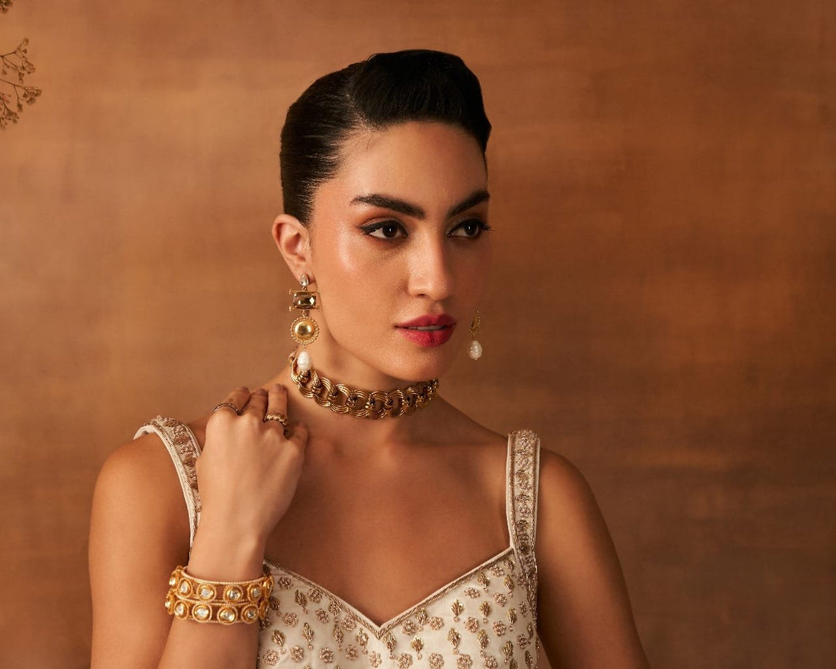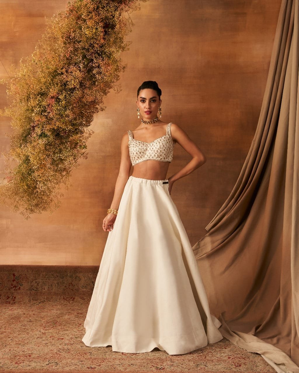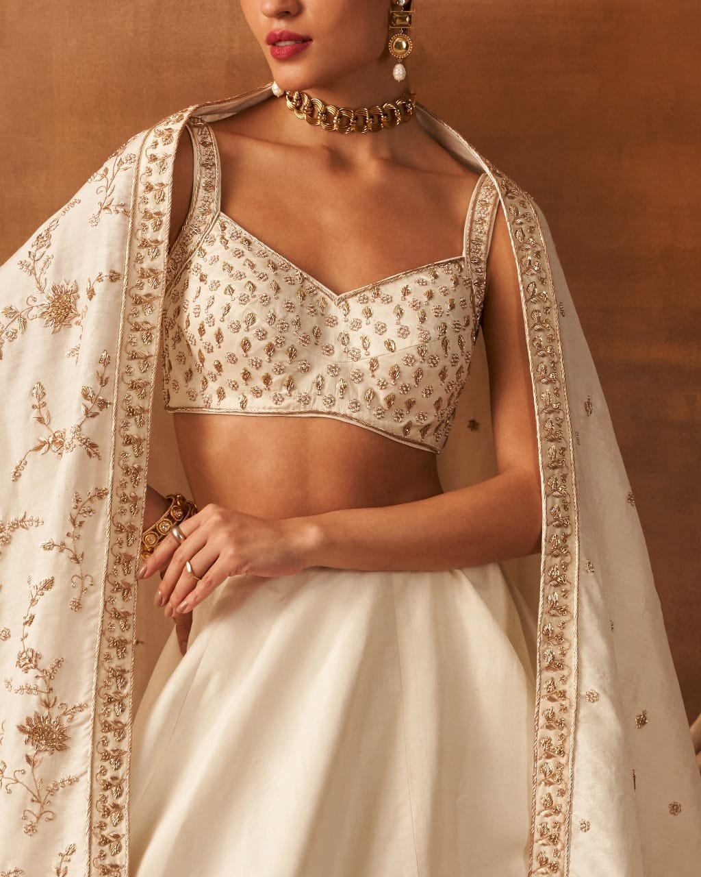 Stylized sweetheart neckline sleeveless blouse and dupatta with dapka, nakshi, small pearls, dori, and sequin embroidery. The plain lehenga is made of handwoven silk (Khurkhul silk), with cotton shantoon lining and cancan layers. The lehenga features a pocket on the right side of the lahenga.
