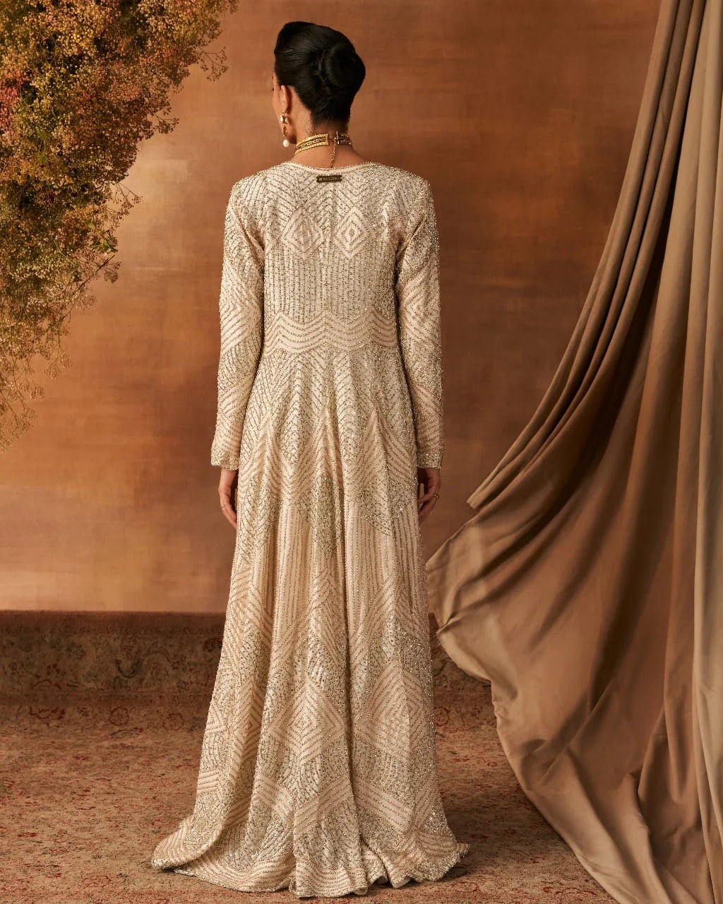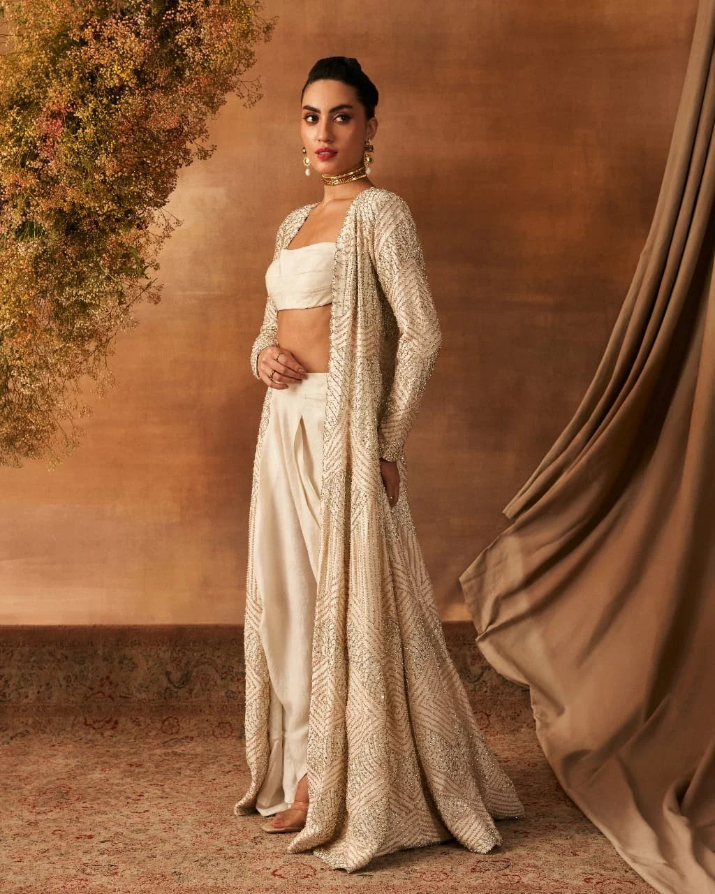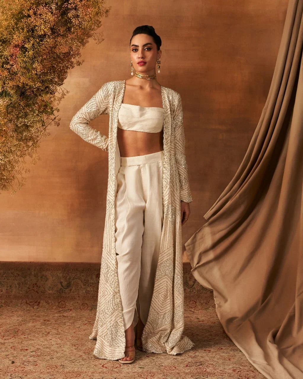 Cropped blouse and dhoti pants with a floor-length jacket featuring dapka, pearls, stones, and sequin embroidery. The entire ensemble is made of handwoven silk (Khurkhul silk) with cotton shantoon lining. The dhoti pants have pockets on both sides of Dhoti Pants.