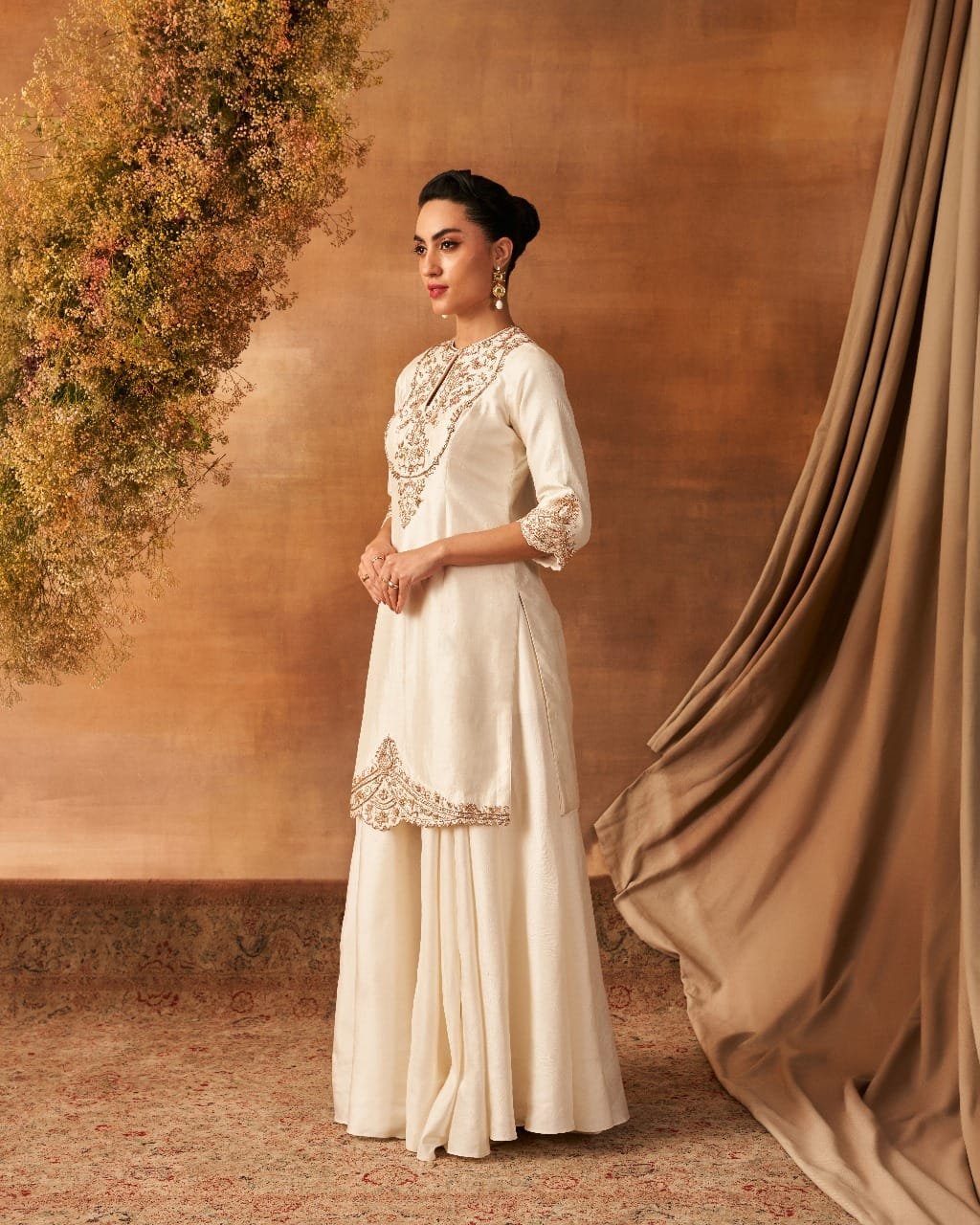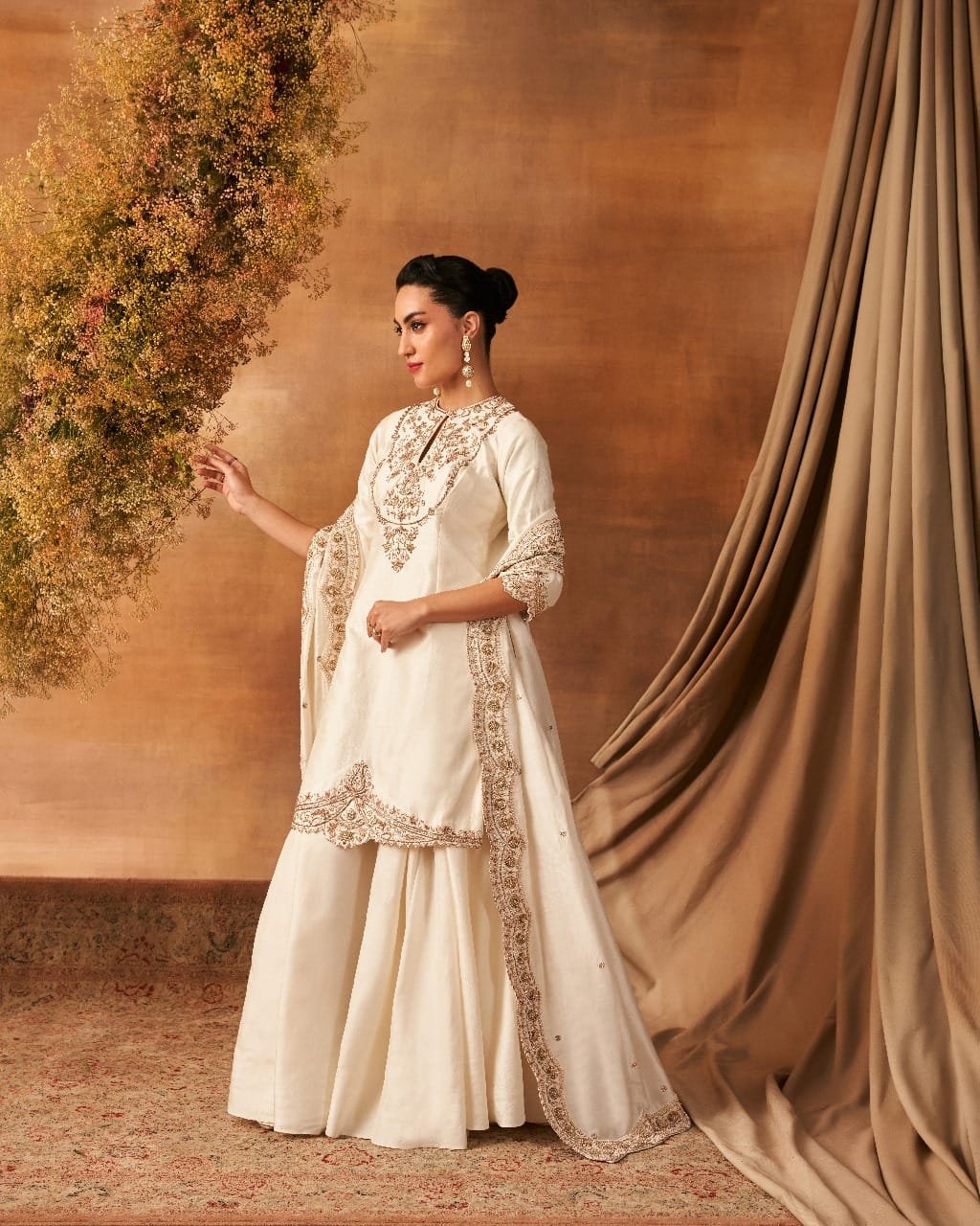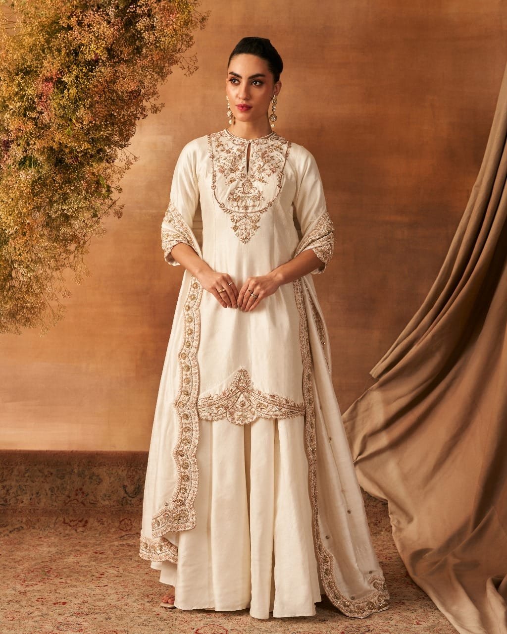 Quarter sleeves kurta and dupatta with dapka, nakshi, small pearls, resham, kasab, and sequin embroidery, paired with a sharara. All pieces are made of handwoven silk (Khurkhul silk) with cotton shantoon lining. The sharara features pockets on both the sides of Sharara.