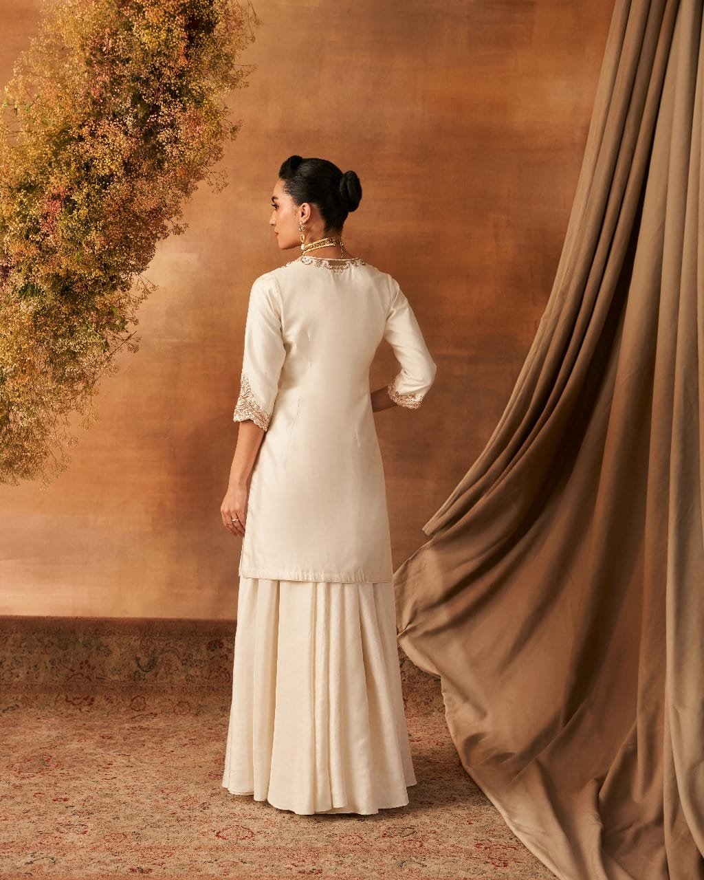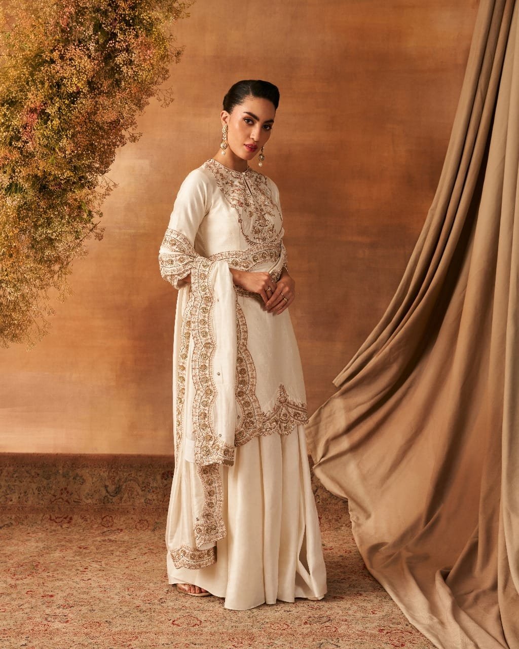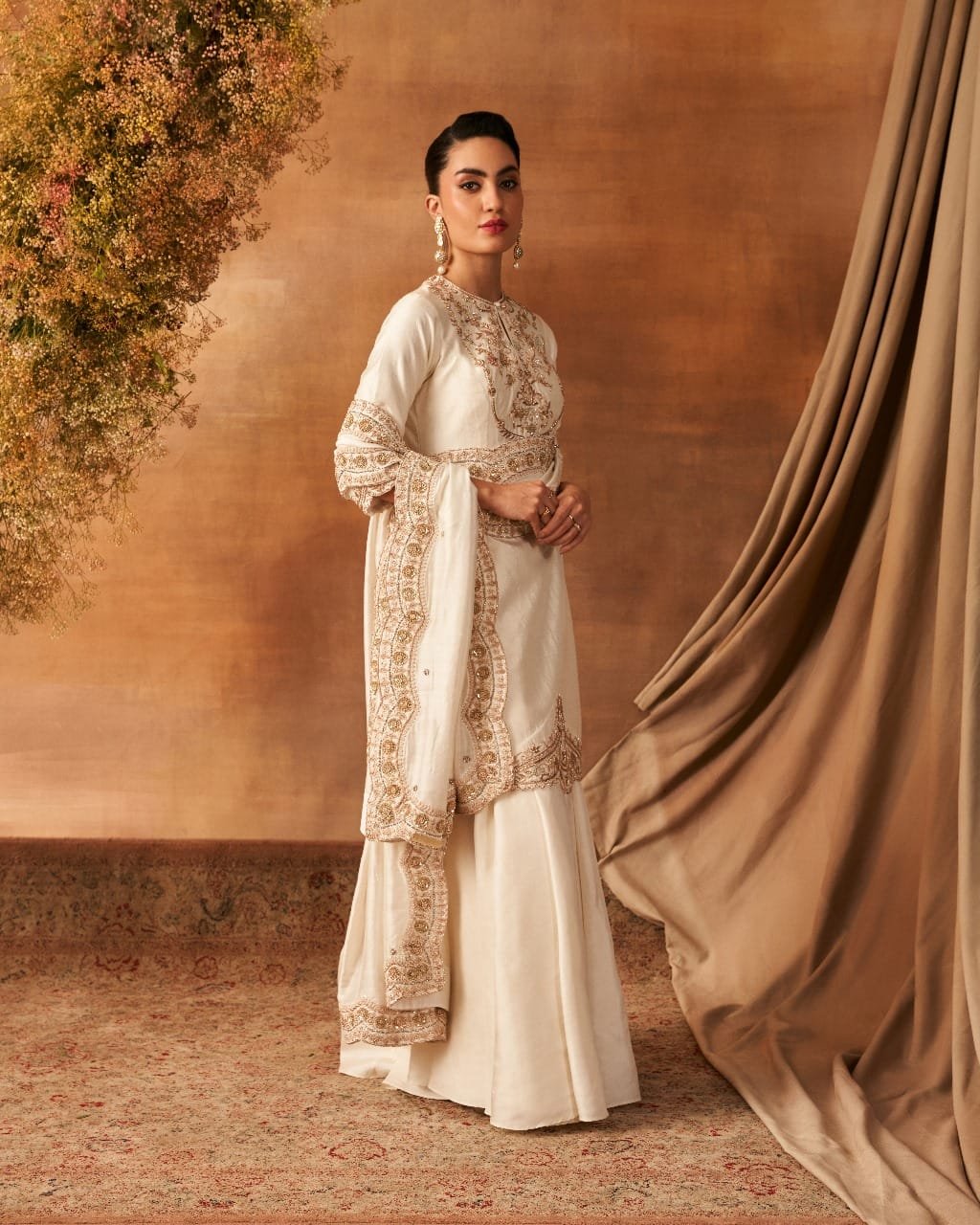 Quarter sleeves kurta and dupatta with dapka, nakshi, small pearls, resham, kasab, and sequin embroidery, paired with a sharara. All pieces are made of handwoven silk (Khurkhul silk) with cotton shantoon lining. The sharara features pockets on both the sides of Sharara.